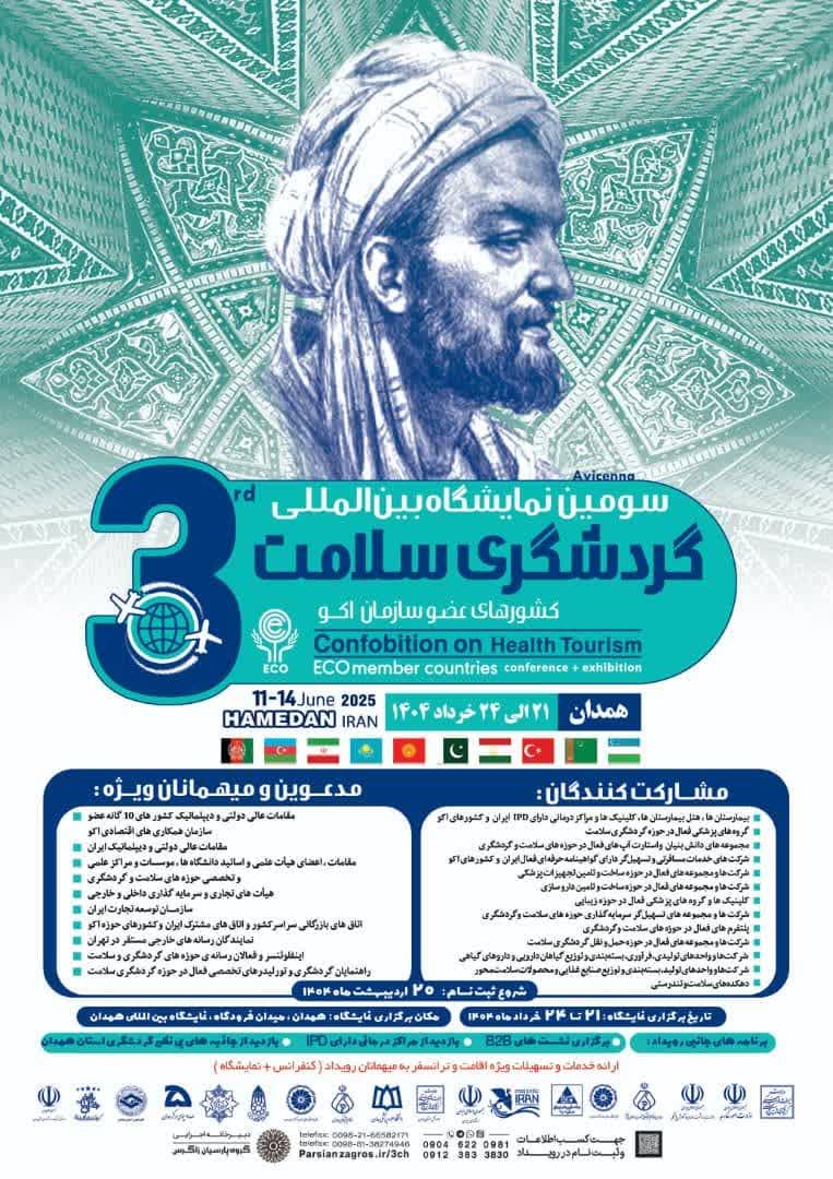 به اطلاع می رساند استان همدان از تاریخ ۲۱ لغایت ۲۴ خردادماه میزبان سومین کنفوبیشن (کنفرانس + نمایشگاه) بین المللی گردشگری سلامت کشورهای عضو سازمان اکو می باشد و از هر کشور عضو اکو، هیئتی مشتمل بر عالی ترین مقامات درمان و سلامت + گردشگری، فعالان بلند پایه پزشکی و گردشگری، مدیران تشکل های گردشگری و درمان و گروههای بخش خصوصی تجاری و اقتصادی و همچنین سفیر هر کشور مستقر در تهران همراه با رایزن اقتصادی سفارت، میزبان این رویداد می باشند. برگزاری با شکوه و حضور پرشور مجموعه های فعال در حوزه های متنوع گردشگری سلامت سراسر کشور در این رویداد بین المللی، ضمن معرفی ظرفیت ها  و توانمندی های تخصصی حوزه های گردشگری سلامت و تندرستی همه استان های کشور، زمینه تبادلات تجاری و  اقتصادی اعم از صادرات، جذب سرمایه گذاری و ارز آوری خواهد بود.